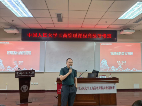 2023年(nián)7月(yuè)15日(rì),範雲↓∞÷÷峰老(lǎo)師(shī)受邀給中國(guó)人(rén)民(mín)大✘±(dà)學工(gōng)商管理(lǐ)研修班的(de)同學,主講《←$§管理(lǐ)者的(de)自(zì)我管理( π ≈lǐ)》課程。